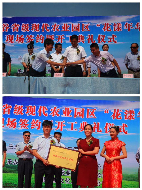 会上,韩建国副县长、中农富通销售部经理米志强、九绿农业董事长张现军签署了《邢台县抱香谷花漾年华开发协议书》。邢台市农工委新农办赵素英主任代表市农工委,授予九绿农业公司“新农村建设示范基地”。