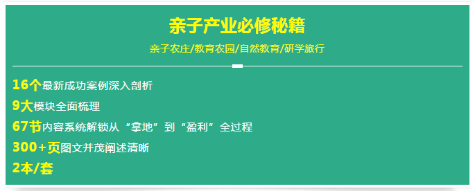 本套书由庄主帮编辑整理,从行业分析、项目选址、规划建设、运营、营销等九大模块系统解读了亲子项目的盈利模式,有需要的朋友可以电话联系购买。