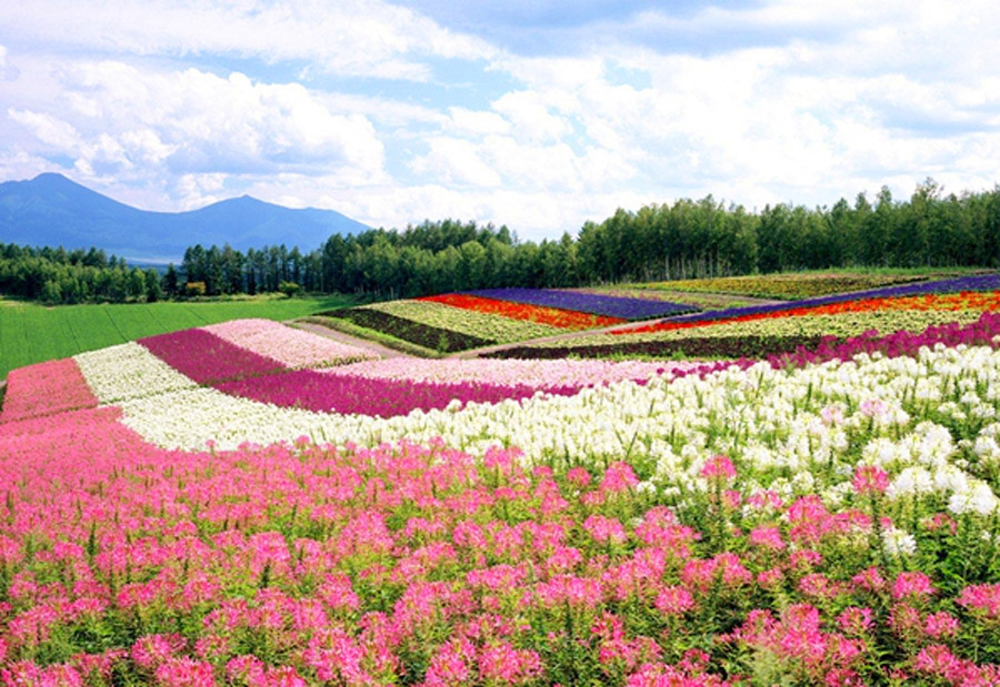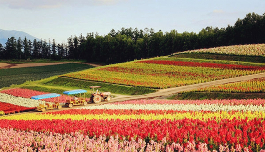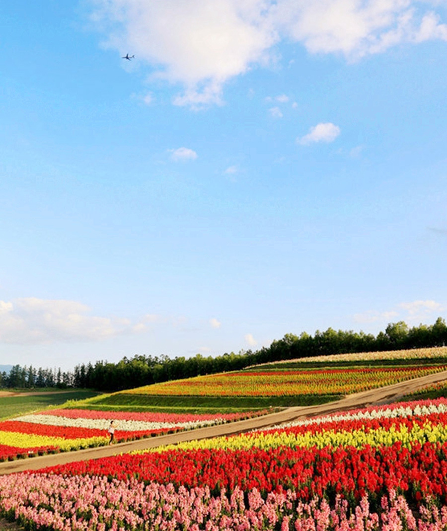 春夏秋冬、四季变换,美瑛顺应着自然的节拍,在每一个季节都呈现出不同的美,这就是美瑛所特有的“北海道风景的节奏”。这种多变可以通过不同种植物的拼接来形成。多种植物插种,形成拼布感,让拼色之美的震撼效应和可变效应构成强大的吸引力。