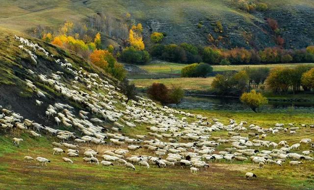 牛羊如星辰在一条绿色的河里畅饮,