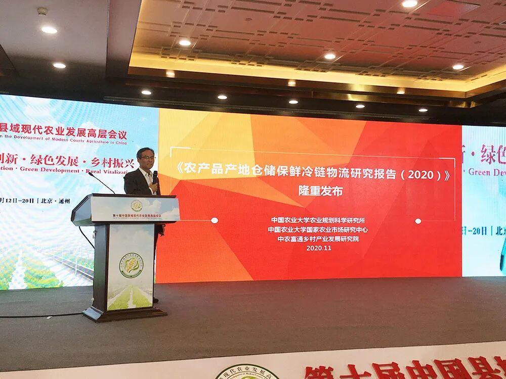 中国工程院院士汪懋华以“数字技术赋能乡村振兴” 为主题进行发言。汪院士通过三个方面为我们讲解了如何建设数字乡村,怎样利用数字为乡村振兴进行赋能等问题。一是要继往开来,把握数字经济发展推动农业产业变革新趋势;二是开拓创新,走向我国农业信息经济创新发展新征程;三是要通过精细农业实践,助推智慧农业系统集成体系创新发展。农业农村部合作经济指导司司长张天佐以“以农业专业化社会化服务引领农业现代化发展”为主题做了精彩报告。并表示在实施乡村振兴战略的大背景下,农业要实现保障国家粮食等重要农产品供给安全、推进高质量发展和实现现代化这些目标,农业社会化服务担当非常重要的角色。农业农村部发展规划司领导以“‘十四五’时期我国农业农村现代化的发展思路与重点”为主题进行了发言。党的十九届五中全会明确提出要坚持把解决好“三农”问题作为全党工作重中之重,优先发展农业农村,全面推进乡村振兴,加快农业农村现代化。农业农村部市场与信息化司副司长刘涵以“中国农业品牌建设与展望”为主题进行了发言。通过详实的案例介绍了我国现阶段农业品牌的建设进展,同时提出了目前尚存的一些问题,并对中国未来农业品牌发展进行了展望。农业农村部南京农业机械化研究所研究员张宗毅就“推进宜机化改造,补齐农业机械化发展短板”为主题进行了发言,通过什么是宜机化,为什么要宜机化,宜机化成本收益以及如何推进宜机化四个方面进行了阐述,在耕地资源高效利用方面为我们带来了深刻的思考。中国农业科学院农业经济与发展研究所研究员朱立志以“新时期农业生态转型方略”为主题进行了发言。他表示,我国农业当务之急,必须全面实行生态转型。但是,这并不是要走传统生态农业的老路,仅仅注重生态,而是要走现代生态农业“质”与“量”兼顾的高效生态道路。只有这样,才能可持续推进我国农业现代化发展。随后,中国农业大学国家农业市场研究中心主任、韩一军教授代表课题组发布了《农产品产地仓储保鲜冷链物流研究报告(2020)》。最后是特邀嘉宾对话环节,北京工商大学教授、中国农业展览协会农产品电商工作委员会主任洪涛担任此环节的主持人,对话围绕“重构农产品现代流通体系,探寻县域发展新道路”这一主题展开讨论。农业农村部市场与信息化司品牌与流通促进处副处长沈国际,中国农业大学教授、农业规划科学研究所所长、中农富通首席专家张天柱,中商商业经济研究中心研究员于淑华,山西省农业农村厅果业总站站长冯耀斌,北京工商大学区域金融工程研究中心主任、中国区域经济学会区域金融专业委员会主任委员杨德勇,各位嘉宾分别从实践的角度出发,结合具体情况,为我们分享了如何重构农产品现代流通体系,探寻县域发展新道路。