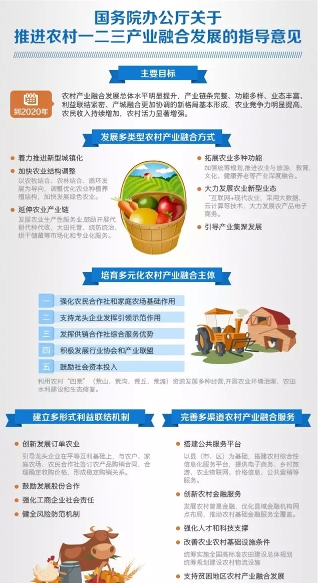 2015年12月24日,我国“三农”最高会议——中央农村工作会议在京召开。会议就农业现代化做出重大部署,着重提出“挖掘农业内部潜力,把产业链、价值链等现代产业组织方式引入农业,促进一二三产业融合互动”,并首次明确提出要大力鼓励商业化运营农村服务业。2016年1月4日,在会议闭幕不到10天,国务院再添一把热火,印发《关于推进农村一二三产业融合发展的指导意见》,明确提出“以新型城镇化为依托,推进农业供给侧结构性改革,着力构建农业与二三产业交叉融合的现代产业体系”,并就发展产业融合方式、培养产业融合主体、完善产业融合服务等方面做出了全面部署。农业三产融合正式进入快车道。