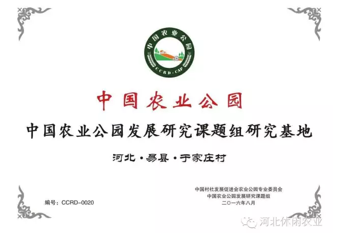 8月27日, 农业部农村经济研究中心、中国村社发展促进会为易县于家庄村“中国农业公园”进行授牌。