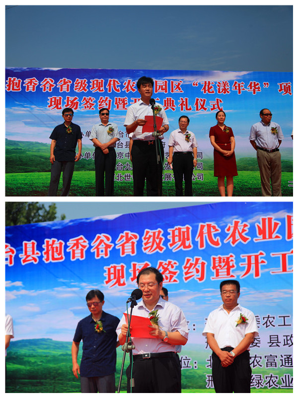 会上,韩建国副县长、中农富通销售部经理米志强、九绿农业董事长张现军签署了《邢台县抱香谷花漾年华开发协议书》。邢台市农工委新农办赵素英主任代表市农工委,授予九绿农业公司“新农村建设示范基地”。