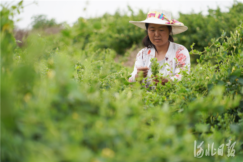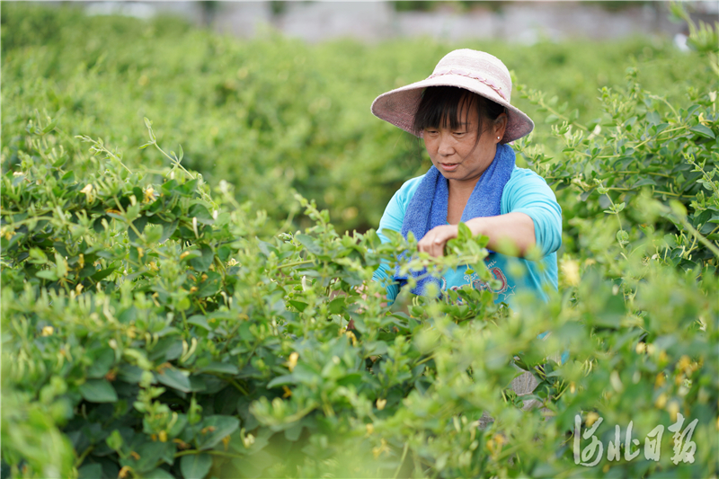 河北省邢台市内丘县大孟村镇刘家庄村农民在采摘金银花