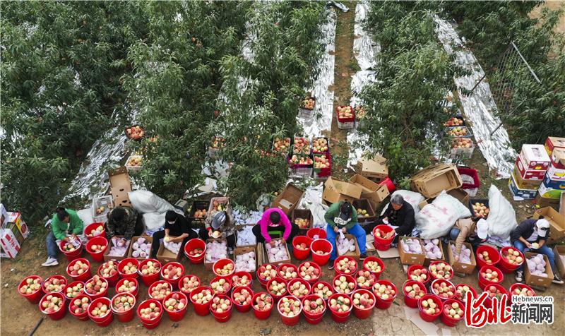 2020年10月11日,河北省遵化市兴旺寨乡朝阳沟村农民在精选秋桃准备装箱外销。