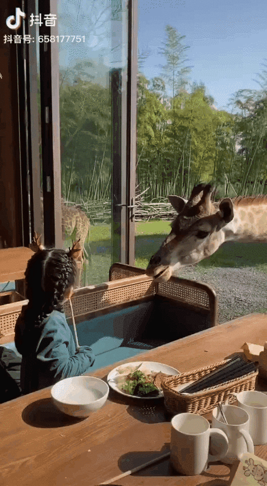 和萌萌的长颈鹿共进早餐。