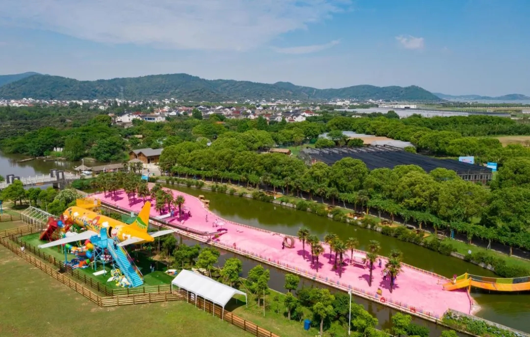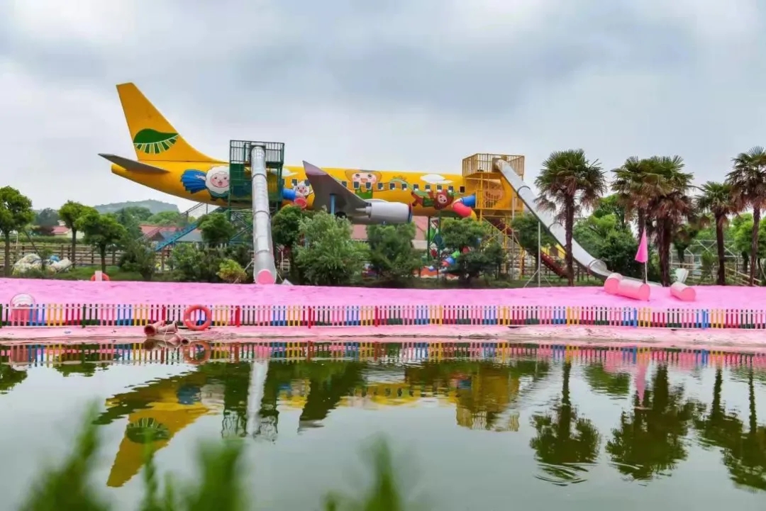 网红项目一:架高4米的飞机滑滑梯和苏州最大的粉色沙滩岛(面积1600㎡)组合,一度抖音刷屏,让农场迅速地在微信朋友圈、小红书、快手等社交媒体上出圈,成为西山岛的地标。