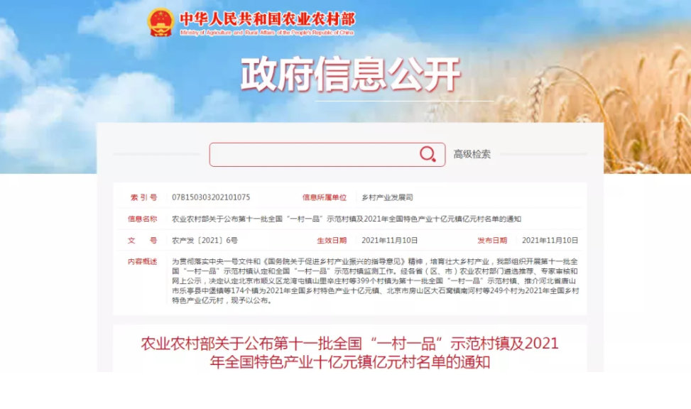 为贯彻落实中央一号文件和《国务院关于促进乡村产业振兴的指导意见》精神,培育壮大乡村产业,经各省(区、市)农业农村部门遴选推荐、专家审核和网上公示,农业农村部于近日发布通知,决定认定北京市顺义区龙湾屯镇山里辛庄村等399个村镇为第十一批全国“一村一品”示范村镇、推介河北省唐山市乐亭县中堡镇等174个镇为2021年全国乡村特色产业十亿元镇、北京市房山区大石窝镇南河村等249个村为2021年全国乡村特色产业亿元村。