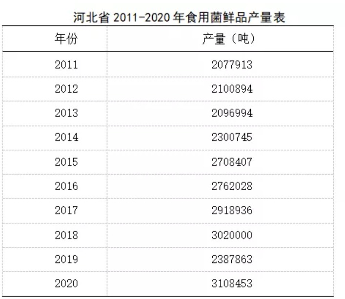 随着农业供给侧结构改革和脱贫攻坚工作持续深化,河北省食用菌产业得到持续稳定发展,产量、产值稳居全国前列,香菇、白灵菇、栗蘑等品种产量全国名列前茅。2020年河北省干鲜混合食用菌总产量165万吨,折合鲜品310万吨,居全国第5位(前四位依次是:河南、福建、山东、黑龙江),总产值为220亿元。全省113个县(市、区)种植食用菌,带动农户34万户,万亩以上大县8个,形成平泉卧龙、阜平天生桥、遵化平安城、临西下堡寺等规模化基地30多个,百亩以上园区302个,标准化菌种场20个,原料加工企业42家,配套设备企业18家,技术服务企业12家,专业菌棒场49家。现有承德森源绿色食品等国家级龙头企业3家,平泉市爆河源食品等省级龙头企业22家。河北光明九道菇作为世界单体较大的工厂化食用菌生产基地,种植面积1万余亩,年产食用菌10万吨以上。