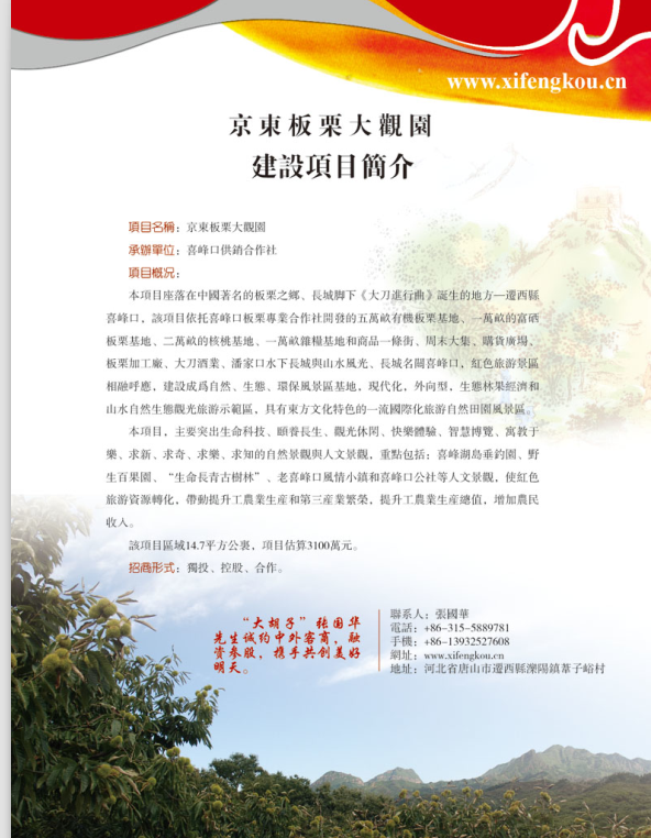 2008年合作社以喜峰口板栗专业合作社的2万亩有机板栗基地四个农业科技创新示范基地潘家口水库水下长城和喜峰口抗战遗址。喜峰雄关大刀园红色旅游景区为依托,大力开发有机农业生态农业,投资3000万元完善了吃、住、行、购、娱、乐等六大功能要素。3800平的环保型木结构会所和百家栗农餐桌、长城人家、板栗人家、渔夫人家、生态饭庄和十台游客电动车,建立了有机板栗采摘园、有机栗蘑采摘园、野生植物采摘园和垂钓园,使游客三季有果摘,四季有鱼钓。为更好的发扬爱国平台作用,我们对抗战遗址进行了整体改造,建立了抗战生活体验区,推出餐桌爱国教育平台.