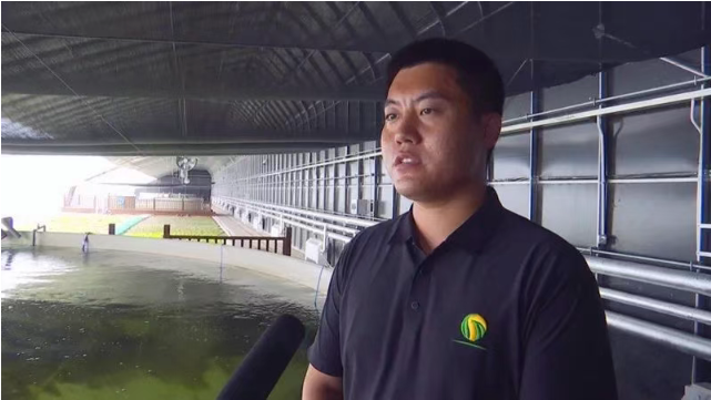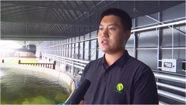 我们这栋温室采用鱼菜共生系统。将水中的饵料、粪便等通过虹吸效应传播到苗床里面,中间有微生物反应系统,也有粪水分离器。通过苗床将水里的残存的杂质过滤,而且菜也能吸收水中的养分,作为它生长必要的能量。通过这两层过滤之后,将水回到集水池里面,通过动力回收将水再回到鱼池里,真正实现了循环共生的系统,而且实现了零土壤、零农残、零化肥。