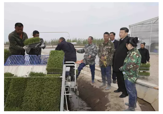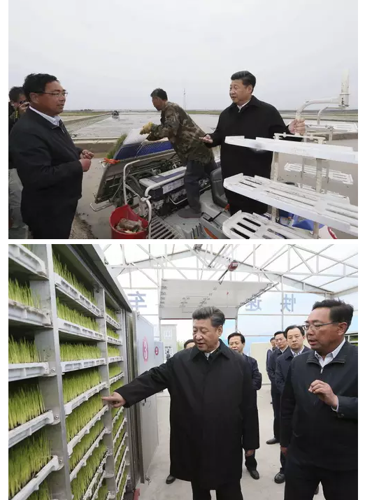 24日上午,习近平来到黑龙江省抚远市玖成水稻种植专业合作社,了解合作社土地流转和采用先进种植技术提高水稻产量效益等情况。总书记登上一台自动插秧机,手扶方向盘,察看仪表盘,询问技术人员机械的工作原理、购买价格、插秧效率等。在快速育秧车间,农技人员介绍利用快速育秧设备进行超早育秧,提升稻米品质情况。总书记问:“这里种植什么品种?”“快速育苗产量能提高多少?”总书记问几位农民,合作社是什么时候成立的,土地流转后收入怎么样,还有什么打算。习近平说,黑龙江作为农业大省,保障国家粮食安全功不可没。在此基础上,要注重经济多元化发展,让农民生活水平不断提高。