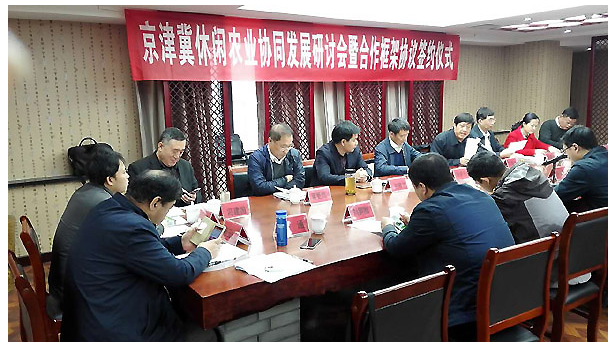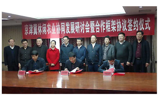 11月3日,京津冀农业主管部门在廊坊市召开了休闲农业协同发展研讨会,签署了京津冀休闲农业协同发展框架协议。会议就依托京津冀三地的地缘优势、资源禀赋、市场优势和创新优势,按照“市场导向、优势互补、资源共享、特色鲜明、共赢发展”的原则,巩固深化合作领域,创新合作推进机制,推进京津冀休闲农业协同发展进行研讨。农业部农村社会事业发展中心副主任程新元、河北省农业厅党组成员吴更雨副厅长(现挂职北京市农村工作委员会副主任)、农业部农产品加工局休闲农业处副处长曹宇出席会议。河北省农业厅党组成员、省委省政府农村工作办公室副主任刘振洲,北京市委农工委委员王修达,天津市农村工作委员会总经济师杨青松出席会议并共同签署合作框架协议。参加会议的还有京津冀三地农业部门休闲农业主管处(站)负责同志及协会代表。