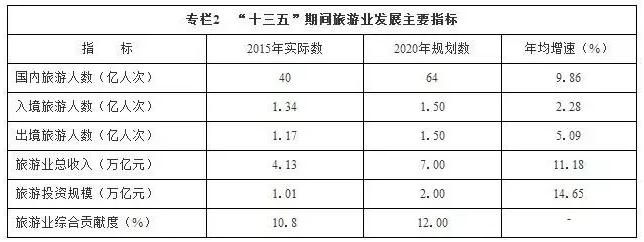 战略性支柱产业基本形成。2015年,旅游业对国民经济的综合贡献度达到10.8%。国内旅游、入境旅游、出境旅游全面繁荣发展,已成为世界第一大出境旅游客源国和全球第四大入境旅游接待国。旅游业成为社会投资热点和综合性大产业。