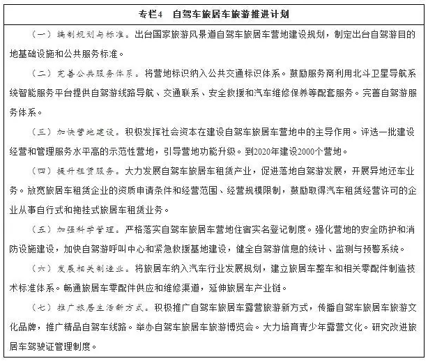 建设一批公共服务完善的自驾车旅居车旅游线路和旅游目的地,培育营地连锁品牌企业,增强旅居车产品设计制造与技术保障能力,形成网络化的营地服务体系和比较完整的自驾车旅居车旅游产业链。(国家旅游局、国家发展改革委、工业和信息化部、公安部、财政部、国土资源部、环境保护部、住房城乡建设部、交通运输部、体育总局、工商总局)