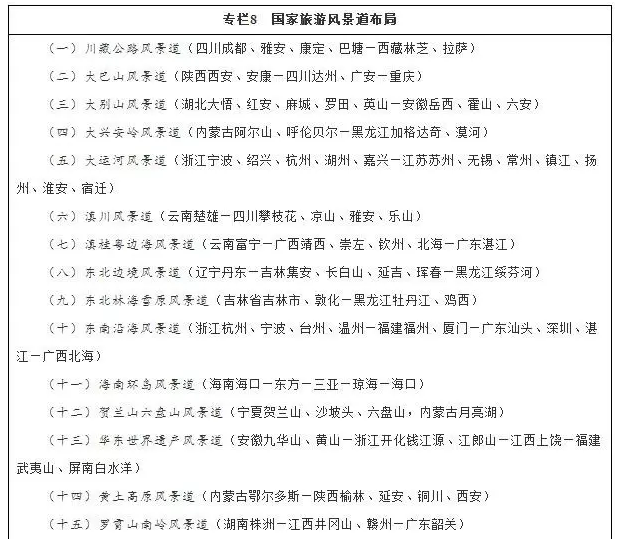 遵循景观延续性、文化完整性、市场品牌性和产业集聚性原则,依托线性的江、河、山等自然文化廊道和交通通道,串联重点旅游城市和特色旅游功能区。重点打造丝绸之路旅游带、长江国际黄金旅游带、黄河华夏文明旅游带、长城生态文化旅游带、京杭运河文化旅游带、长征红色记忆旅游带、海上丝绸之路旅游带、青藏铁路旅游带、藏羌彝文化旅游带、茶马古道生态文化旅游带等10条国家精品旅游带。(国家旅游局、国家发展改革委、交通运输部、文化部、国家海洋局、国家文物局等)
