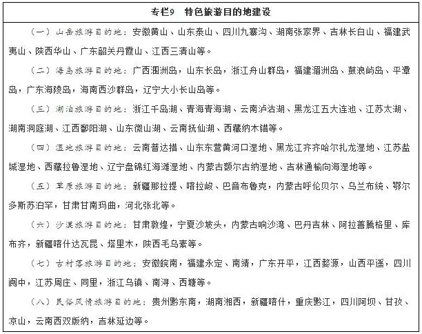 依托特色旅游资源,打造一批特色旅游目的地,满足大众化、多样化、特色化旅游市场需求。(国家旅游局、环境保护部、住房城乡建设部、水利部、国家林业局、国家海洋局、国家文物局等)