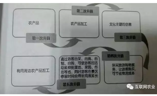 乡村旅游开发经营不仅要尽量做到旅农结合、以农促旅、以旅促农,还应尽量做到乡村旅游发展与文化创意产业、商贸业、交通运输业、循环经济建设、美丽乡村建设、新型城镇化等的发展和物质文化遗产、非物质文化遗产保护利用实行深度联动,使乡村旅游产业发展的引擎得到强化、活力得到增加、投入得到节约、效益提到提升。譬如,乡村旅游开发与文化创意产业、农业、旅游业、商贸业等的发展有机结合在一起,可使乡村旅游景点农产品获得五次升值机会(见下图)。